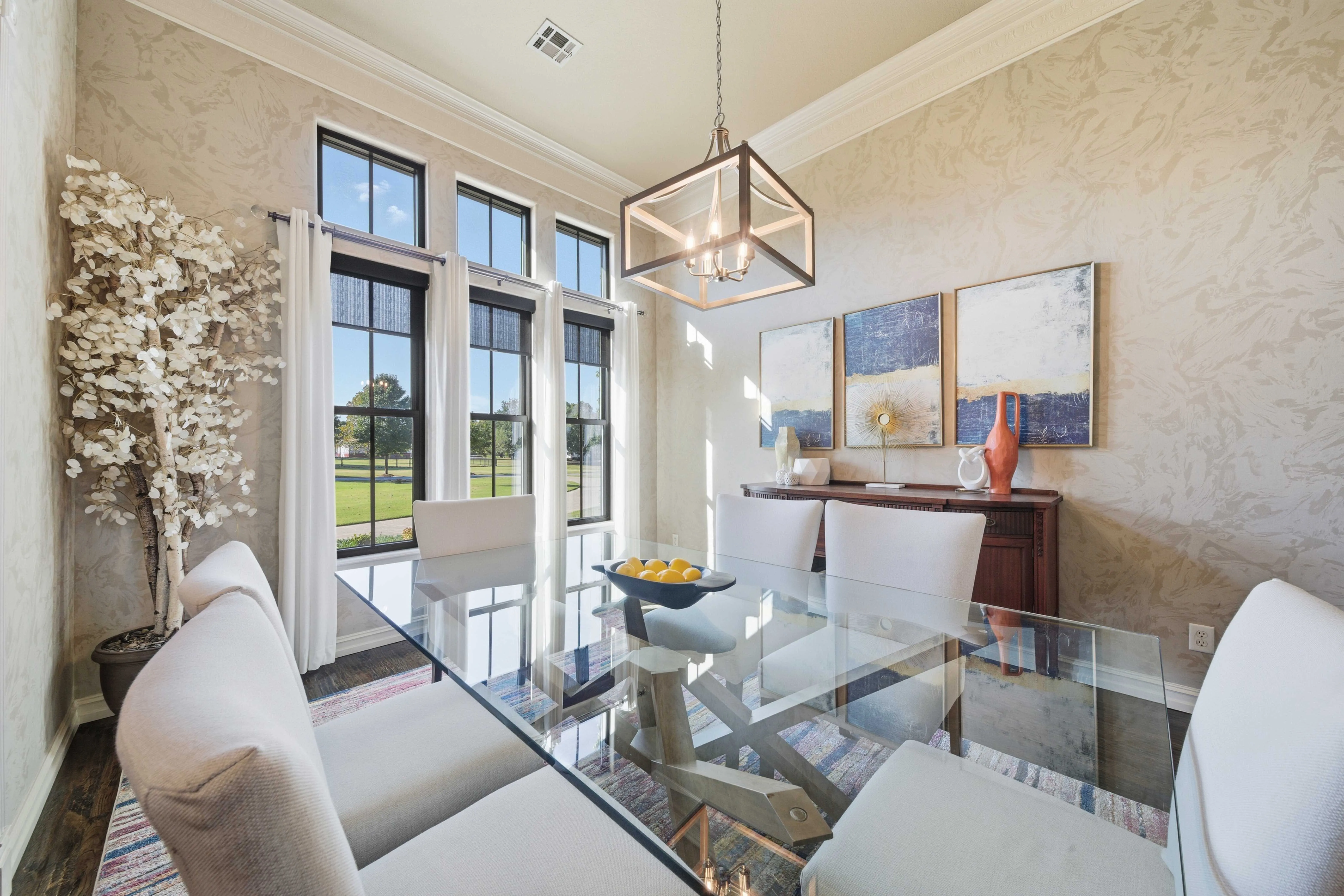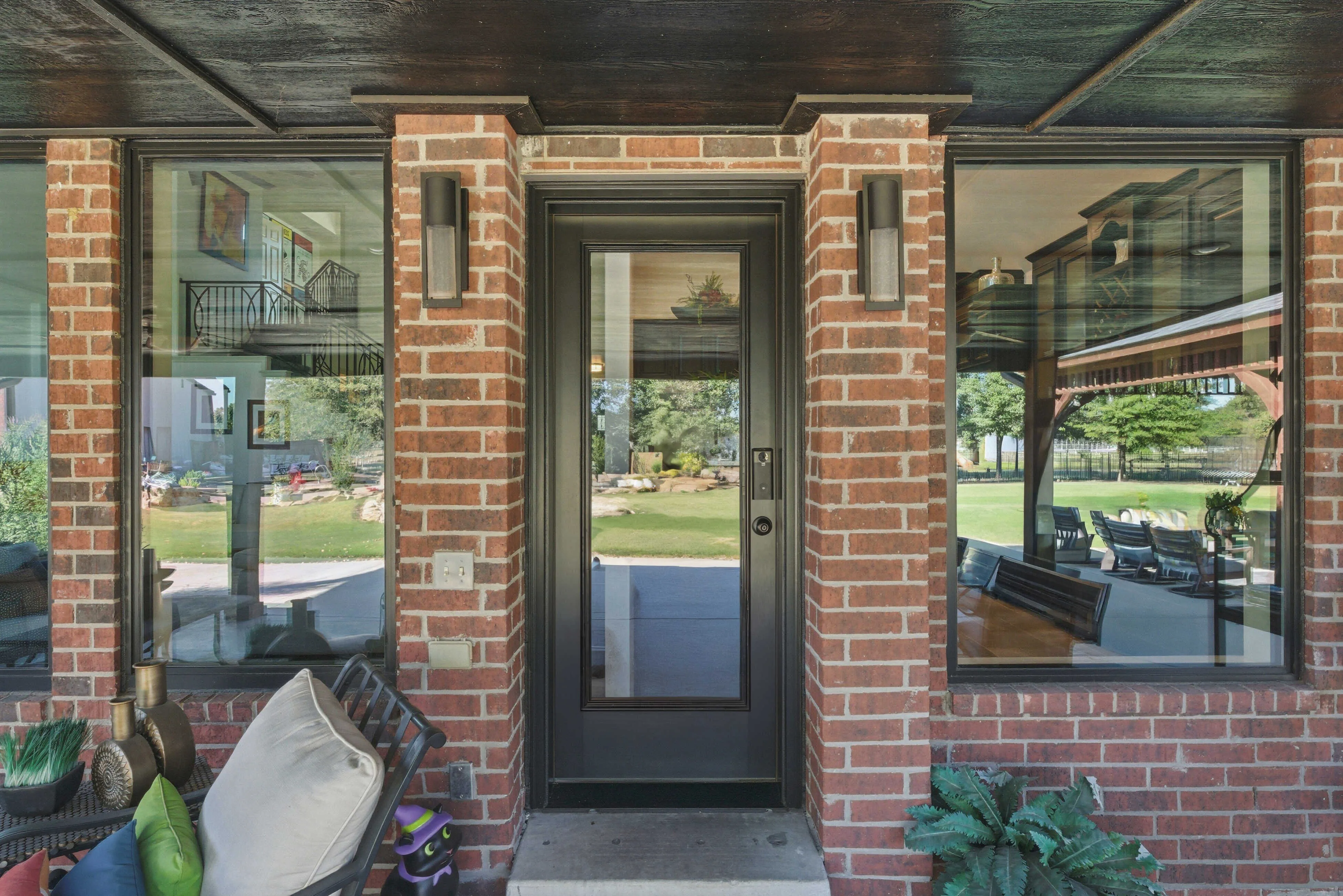 For this stately Broken Arrow home, black windows with a modern divided lite pattern creates a perfect compliment for the exterior. The expansive glass of the living room picture windows really opens up the room! Thermal barrier aluminum frames, black finish, single hung, horizontal sliding and picture windows with Therma-Tru exterior door.