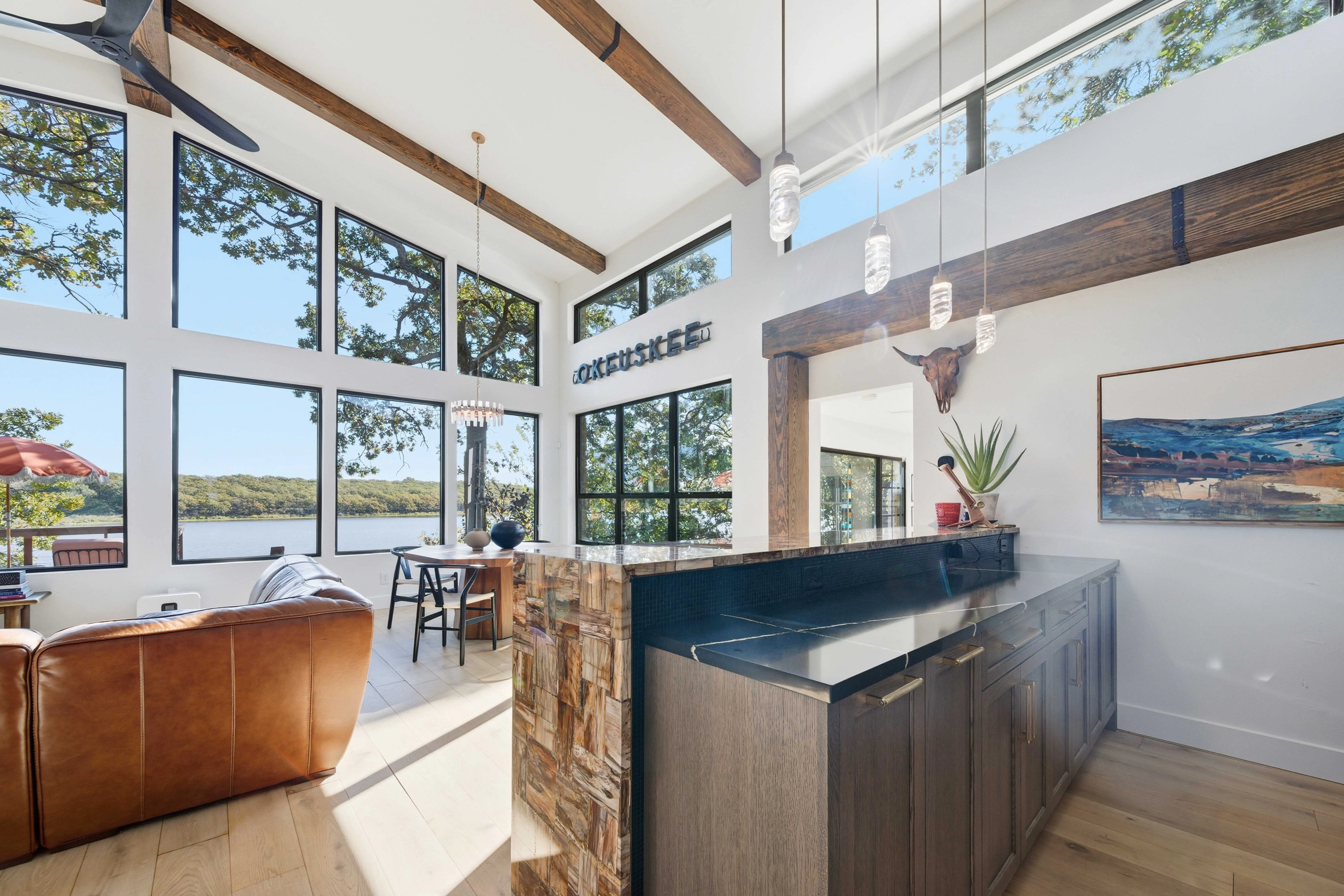After a fire damaged the home, the owners of this Okemah Lake property decided to change up the style. The thermal barrier aluminum windows and doors in black finish really contract with the new white interior, making the entire home feel larger! Products used include single hung, horizontal sliding and picture windows, sliding glass door and Therma-Tru exterior doors.